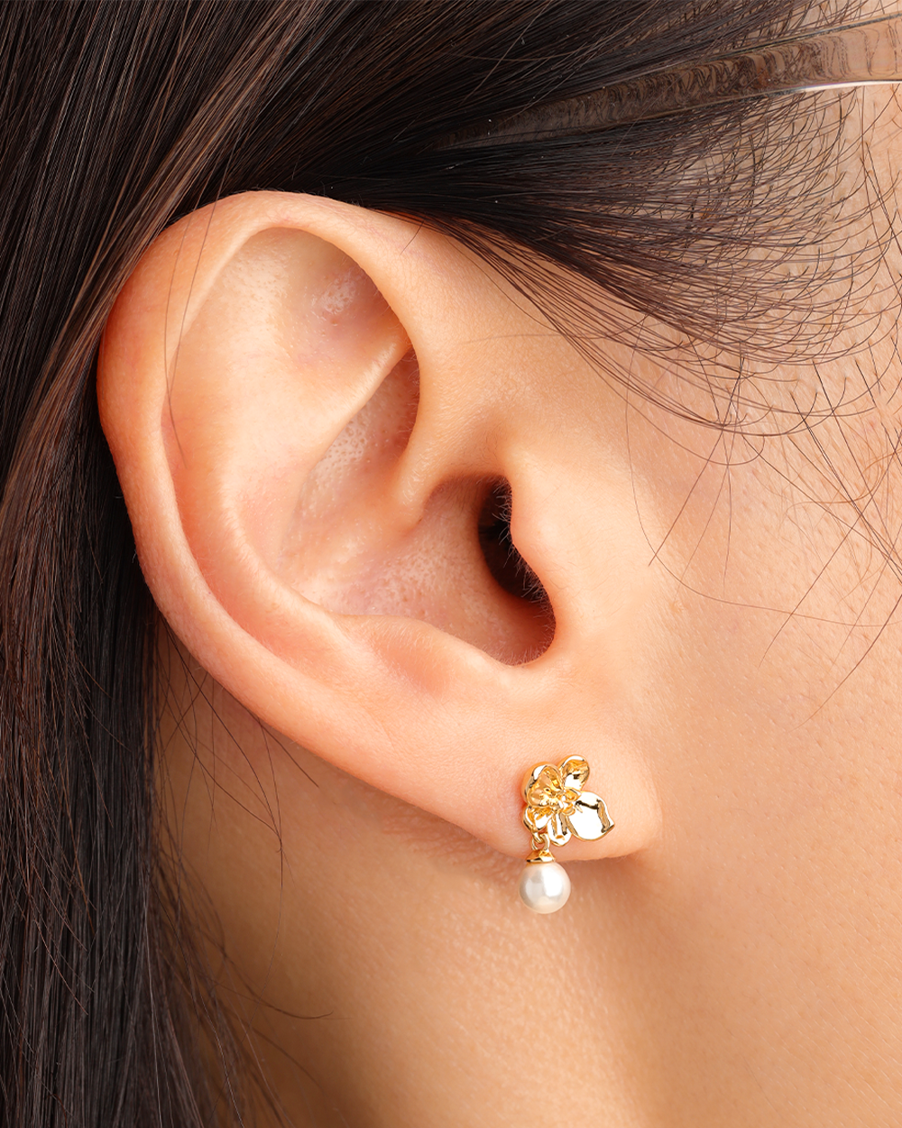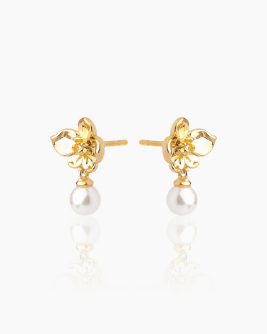 The Caitlin Gold Stud features a charming orchid gold design with a single, shell pearl delicately suspended below. This earring offers a unique and elegant take on floral studs, perfect for adding a touch of natural beauty to your ear stack.