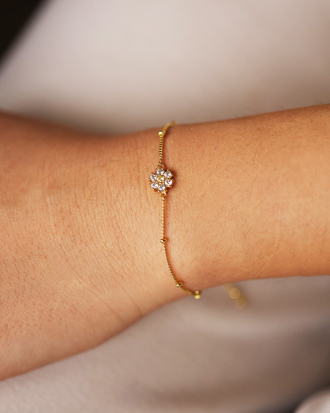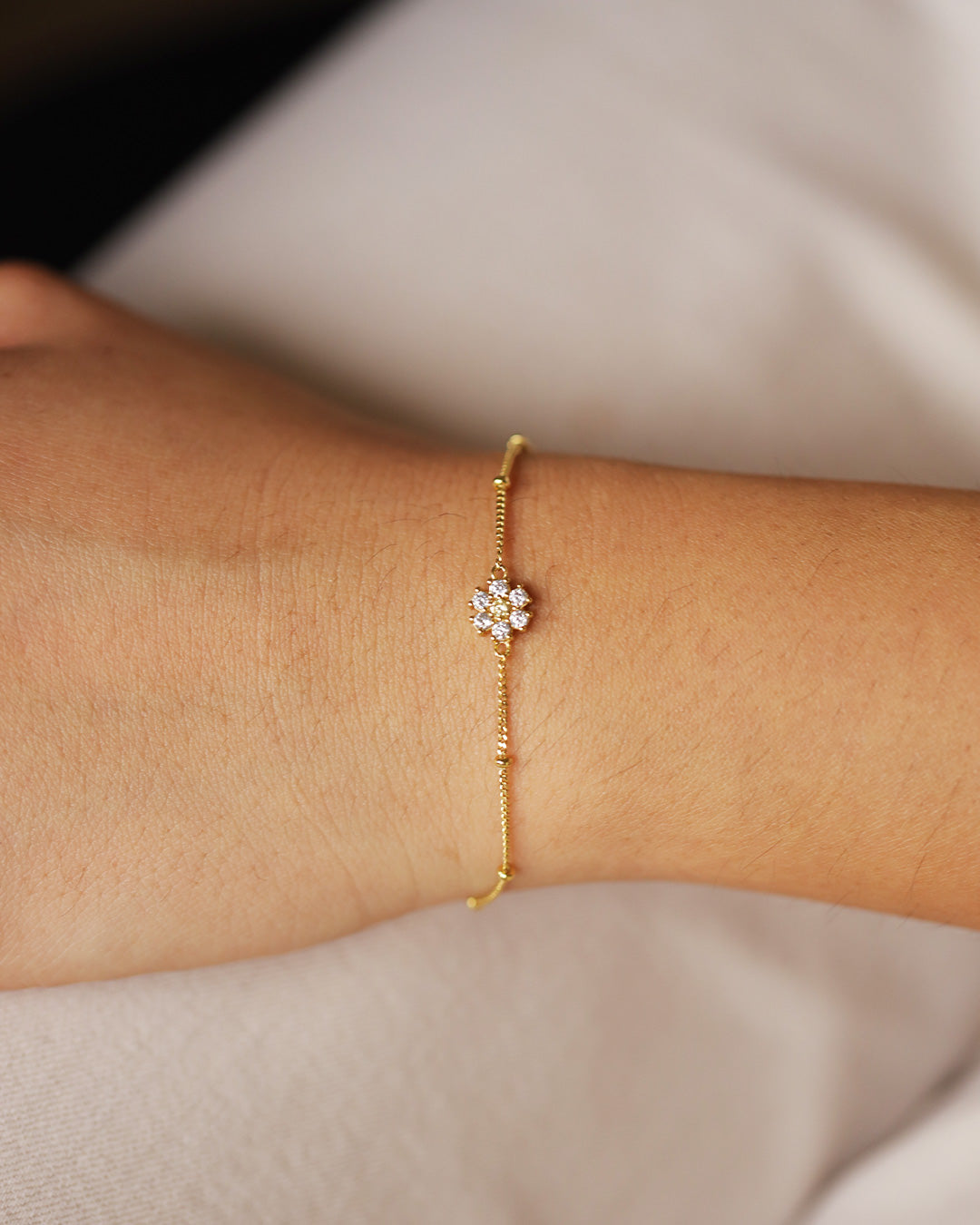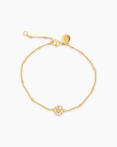 Add a touch of botanical elegance to your wrist with the Flora Gold Bracelet. This piece features a sparkling flower cluster center, perfectly complemented by a bobble chain. The combination of the floral design and the beaded chain adds unique dimension and feminine shine to your jewelry collection.