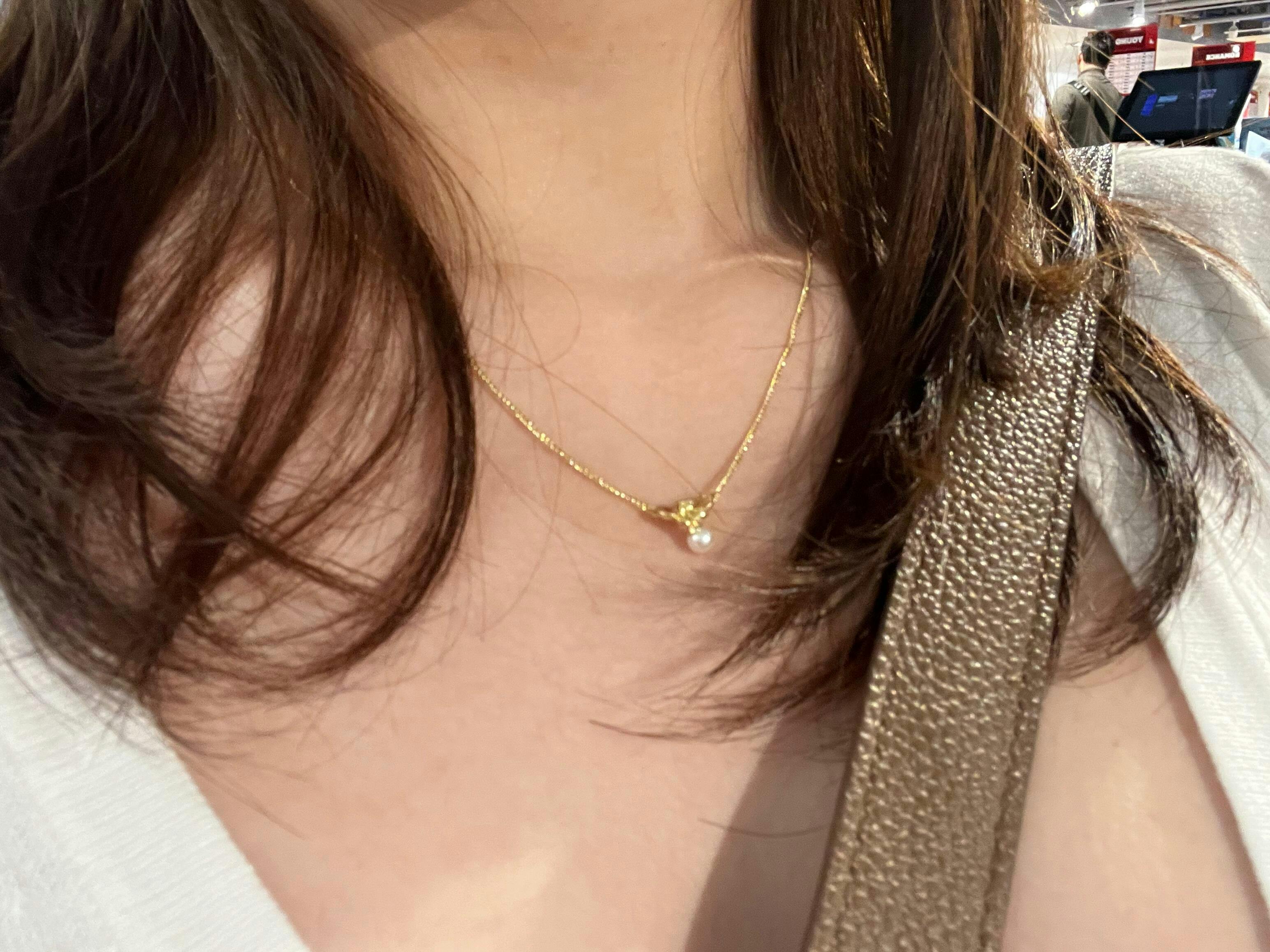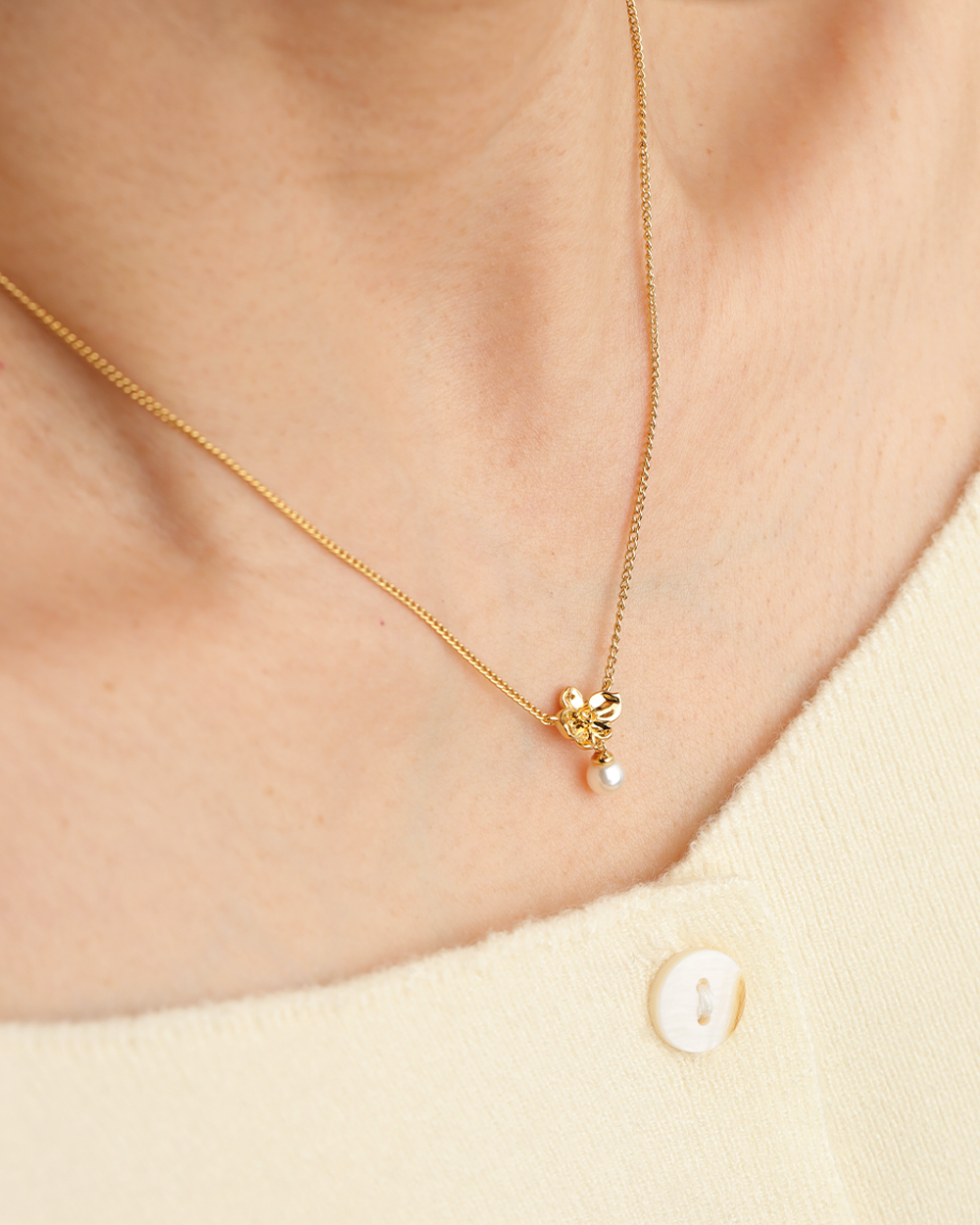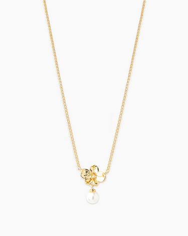 The Ines Gold Necklace features a graceful orchid gold pendant, suspended from a delicate gold chain. A single, shimmering shell pearl dangles beneath the floral motif, adding a touch of subtle movement and charm. This necklace offers a refined way to wear botanical-inspired jewelry.