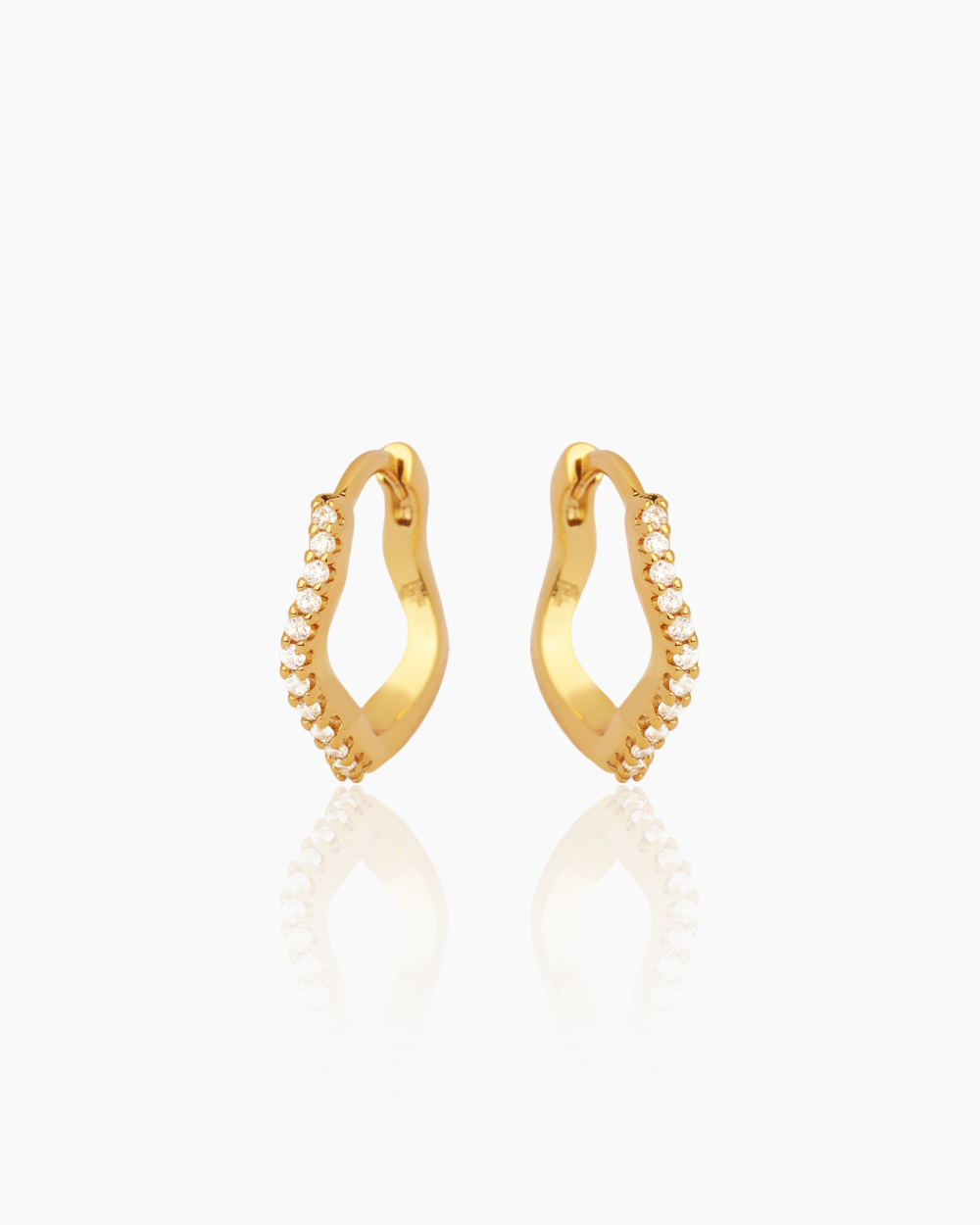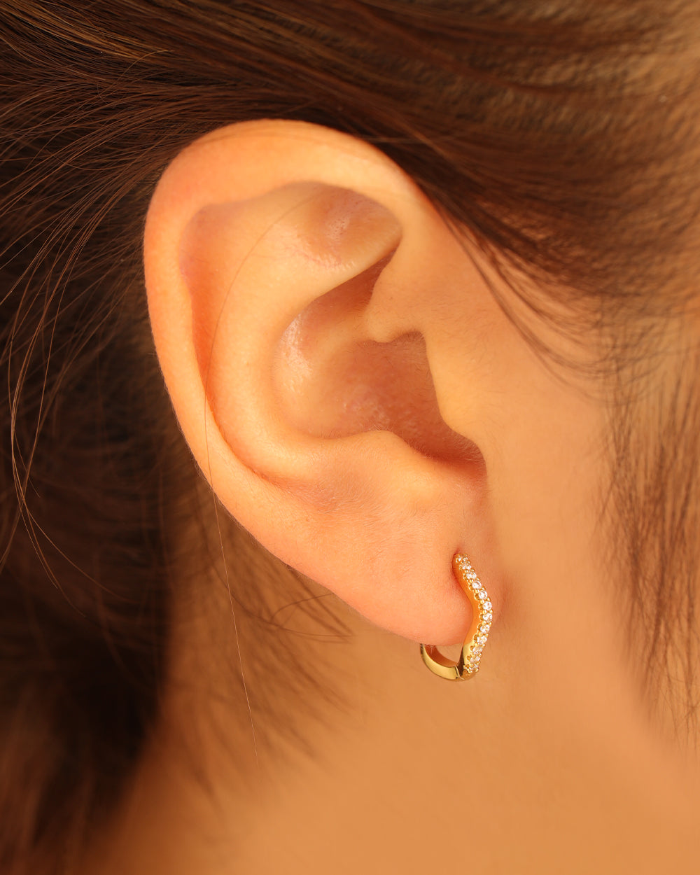 The Joni Gold Huggies feature a delicate curve, paved with tiny cubic zirconia stones. This subtle wave shape adds beautiful dimension and fluid sparkle to your ear stack.