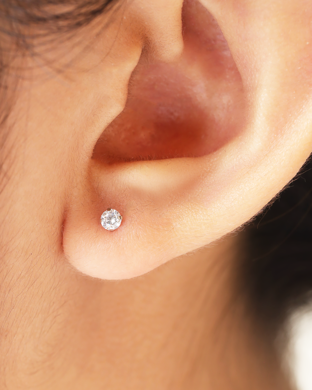 The Kim Flatback Studs feature a single, brilliant cubic zirconia stone set with four prongs for a secure and classic look. These titanium threadless studs are perfect for adding a touch of timeless sparkle to any piercing.