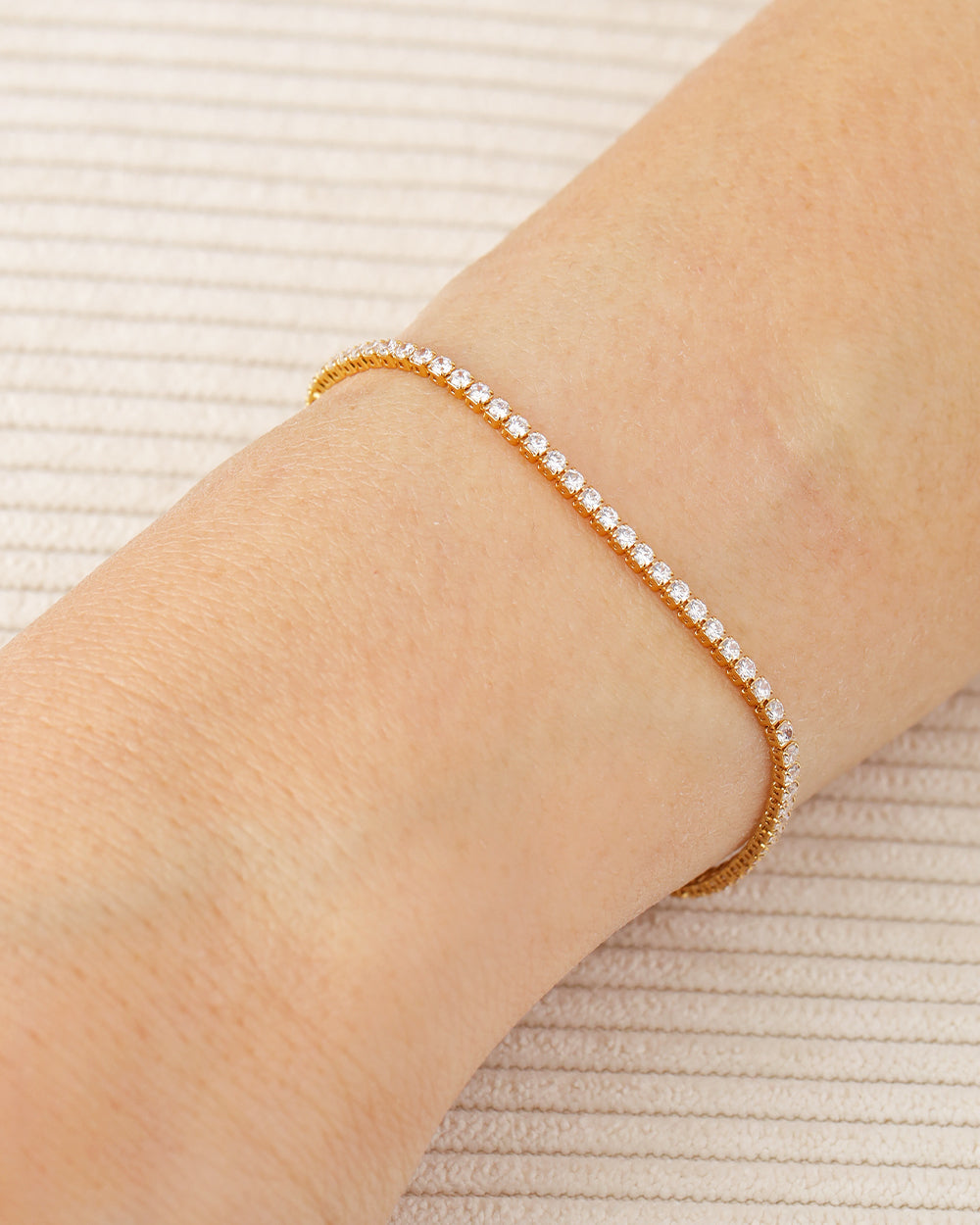 Featuring a dazzling row of Cubic Zirconia crystals, the Kirsten Gold Bracelet is a classic style staple. Whether you wear it on a casual day out or to a formal event, you can’t go wrong with this timeless tennis bracelet.
