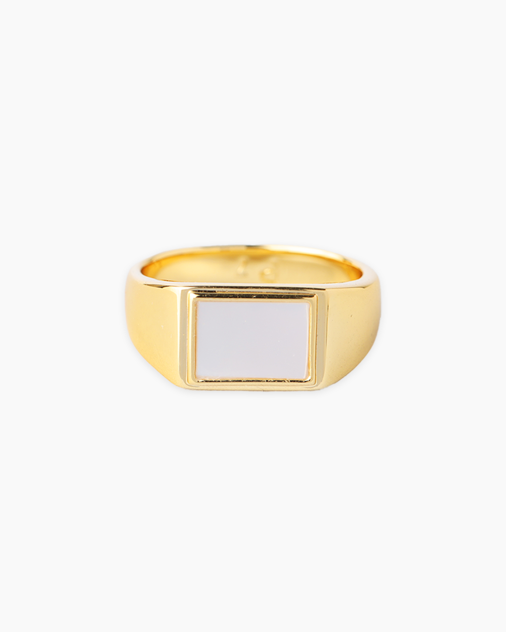 The Mana Gold Ring features a rectangular design with a mother of pearl center, reflecting the natural beauty found in the Philippines. This ring adds a touch of understated elegance and cultural inspiration to your style.