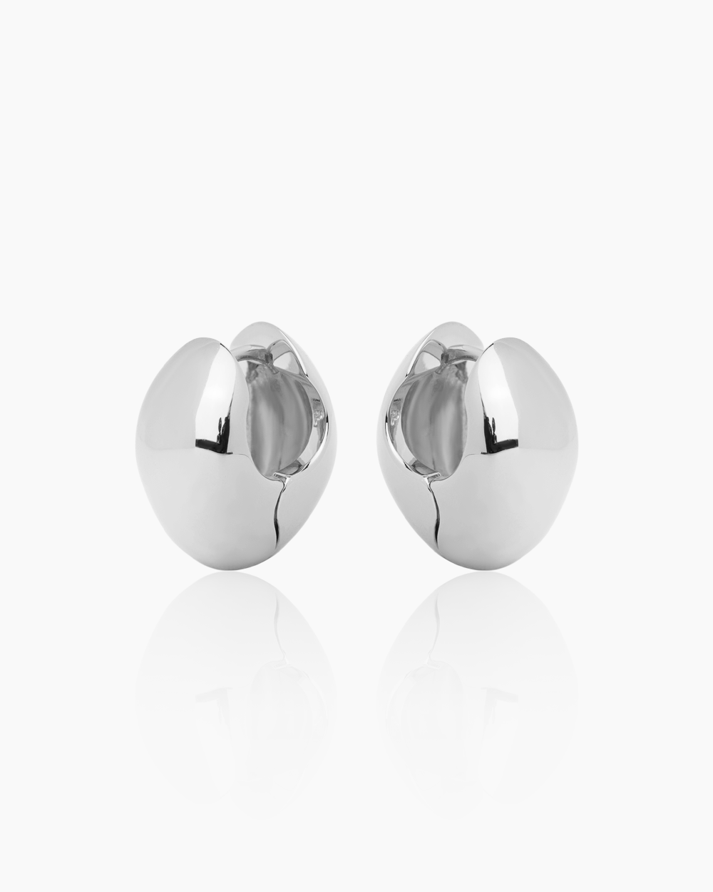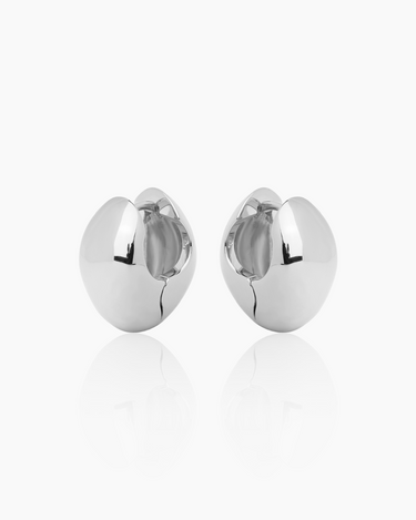 The Nella Silver Huggies are a bold take on the fluid shape, featuring a smooth, convex, bean-like design. These chunky, highly polished huggies offer a sculptural, high-shine statement perfect for modern elegance.