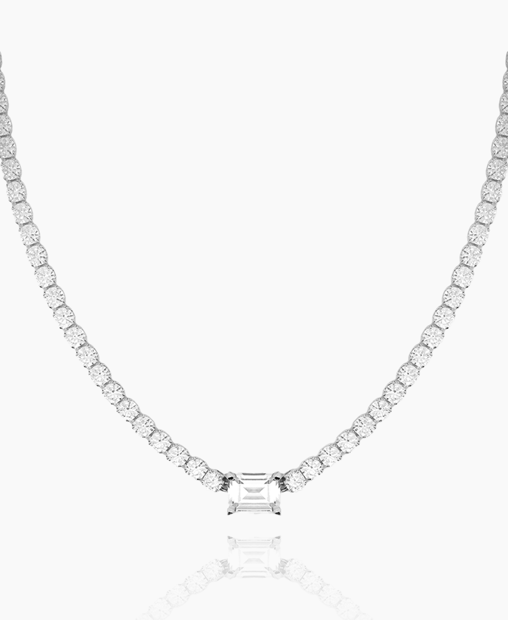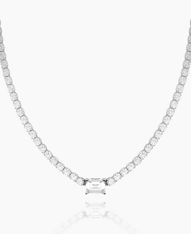 This exquisite design features an opulent tennis chain style and a baguette-cut stone with a four prong setting. Make every event a luxury affair with the Rebecca Necklace.