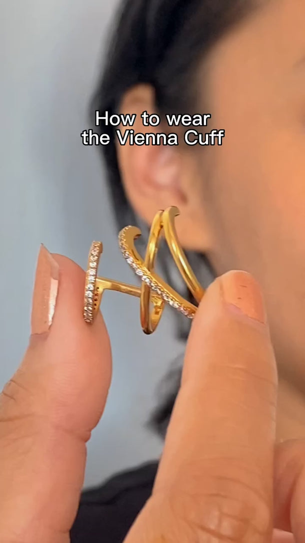 This illusion design will have you looking like you're wearing an exciting trio of crisscrossed suspenders plus an ear cuff, with no piercings needed. Even better, you get the option of wearing it two ways: with the cuff as the cherry on top or at the base of the stack. A definite showstopper, the daring Vienna Cuffs are sure to impress.