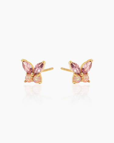 Crafted in gold and adorned with delicate pink cubic zirconia and opal butterflies, the Butterfly Studs capture the playful sophistication of Glinda's world. Perfect for adding a touch of whimsical glamour to your everyday look.