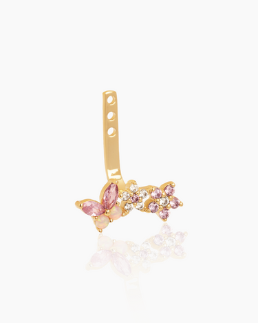 This intricate ear jacket features ascending floral clusters of brilliant pink cubic zirconia set in gold. Designed with an adjustable post for a secure fit that customizes to your earlobe shape and length; offering a modern, magical take on elegance.
